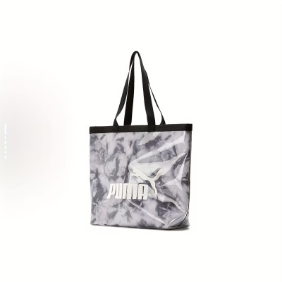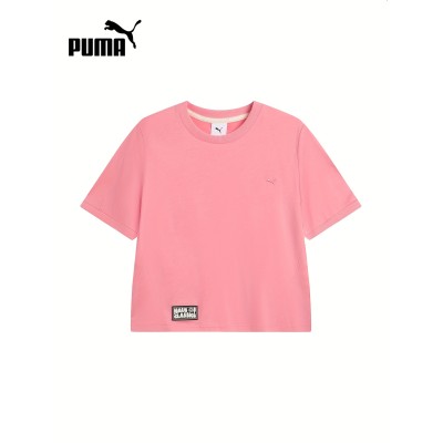 PUMA Unisex Sporty Casual Short Sleeve T-Shirt - Light Grey with Black Letter Print, Drop Shoulder Design, Breathable Round Neck Summer Tee for Men & Women